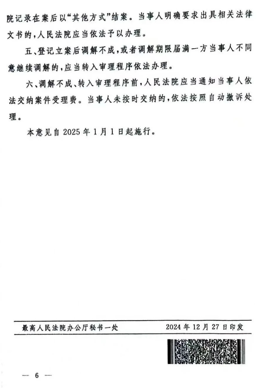 为深入贯彻习近平法治思想,巩固深化立案登记制改革成果,切实保障当事人依法行使诉权,根据《中华人民共和国民事诉讼法》,现就严格依法规范民事案件登记立案后开展调解工作,提出如下意见。一、坚持和发展新时代“枫桥经验”,坚持立案登记制改革不动摇,切实把非诉讼纠纷解决机制挺在前面,全面落实自愿、合法原则,从制度上、源头上解决未经立案先行调解、强制调解、久调不决等“立案难”“不立案”问题。二、对符合法律规定条件的民事起诉,人民法院应当严格依法登记立案。适宜委托调解的,经征得当事人同意,在转入审理程序前,可以委托调解员或者调解组织调解。三、登记立案后开展调解工作的案件,调解期限自调解员或者调解组织签字接收法院移送材料之日起计算。适用普通程序的调解期限为15日,适用简易程序的调解期限为7日。但是,双方当事人同意延长的,可以将调解期限延长30日,延长的调解期限不计入审理期限。四、当事人达成调解协议,撤回起诉或者即时履行的,人民法院记录在案后以“其他方式”结案。当事人明确要求出具相关法律文书的,人民法院应当依法予以办理。五、登记立案后调解不成,或者调解期限届满一方当事人不同意继续调解的,应当转入审理程序依法办理。六、调解不成、转入审理程序前,人民法院应当通知当事人依法交纳案件受理费。当事人未按时交纳的,依法按照自动撤诉处理 。